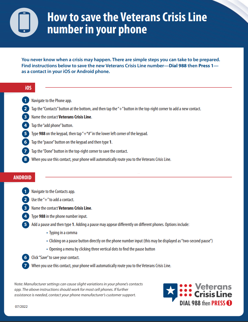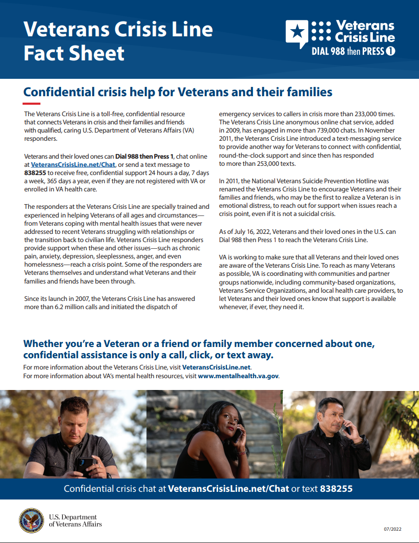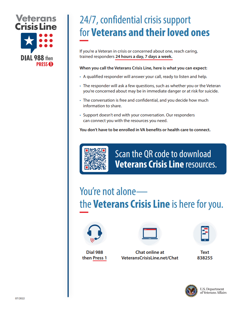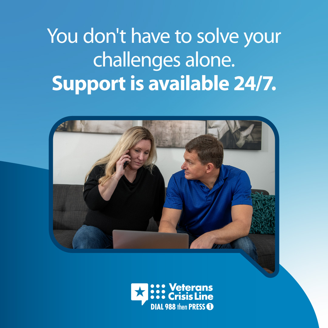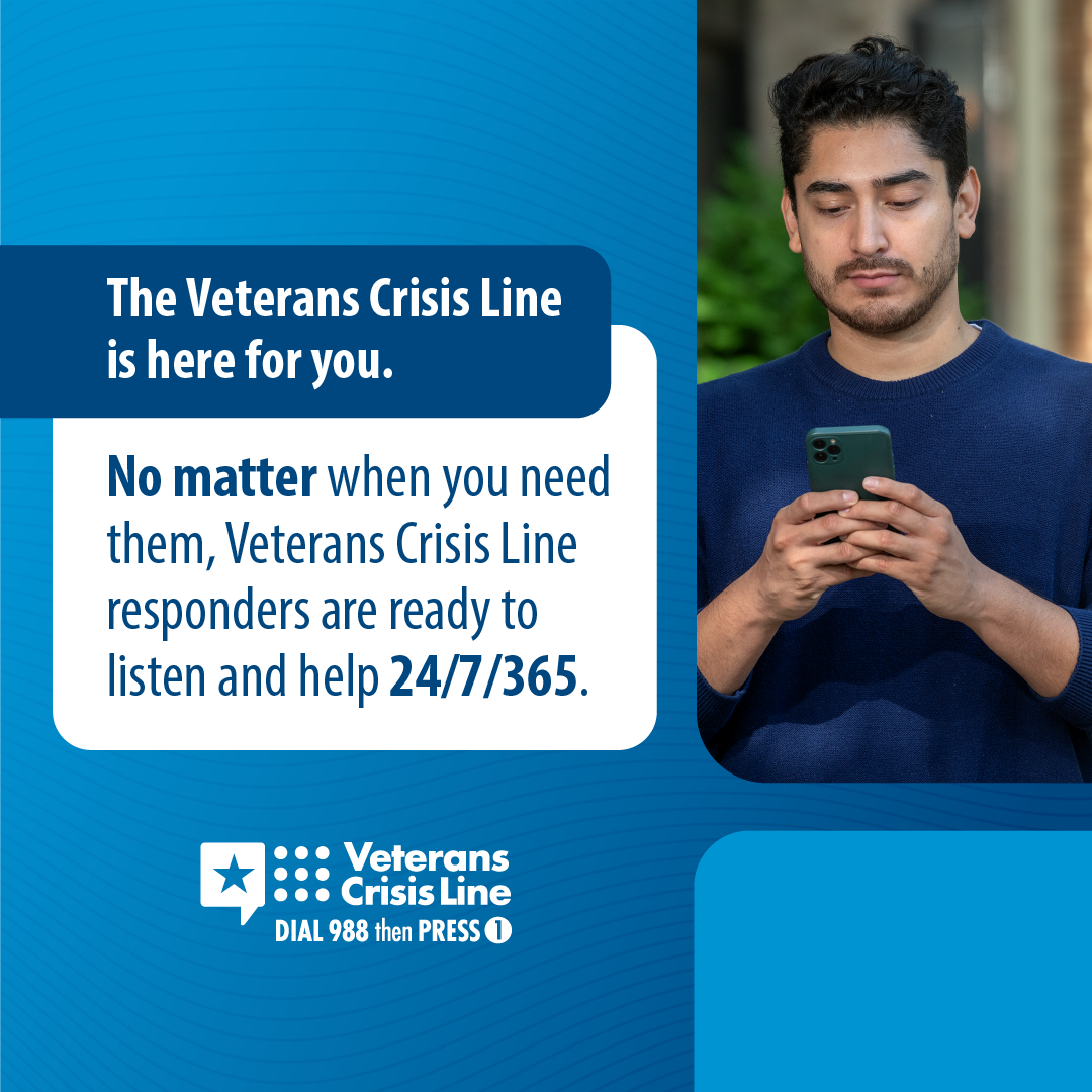 The Veterans Crisis Line offers support 24/7. If you’re a Veteran in crisis or worried about a Veteran, call, chat, or text now.
